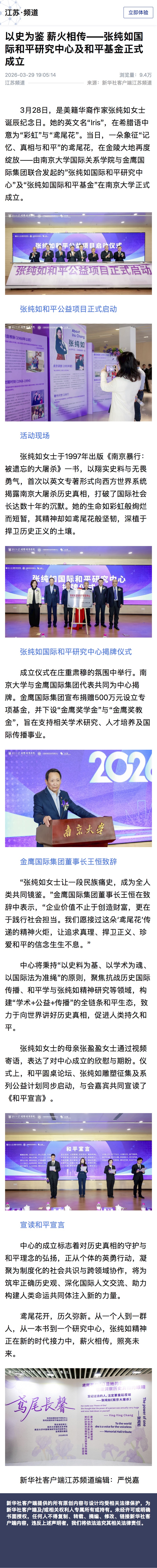 以史为鉴 薪火相传——张纯如国际和平研究中心及和平基金正式成立